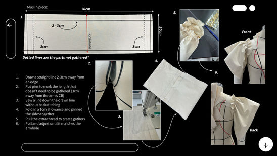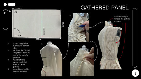 Documentation of dress components for my draping module. I learned to drape components for a dress I designed with techniques such as gathering.